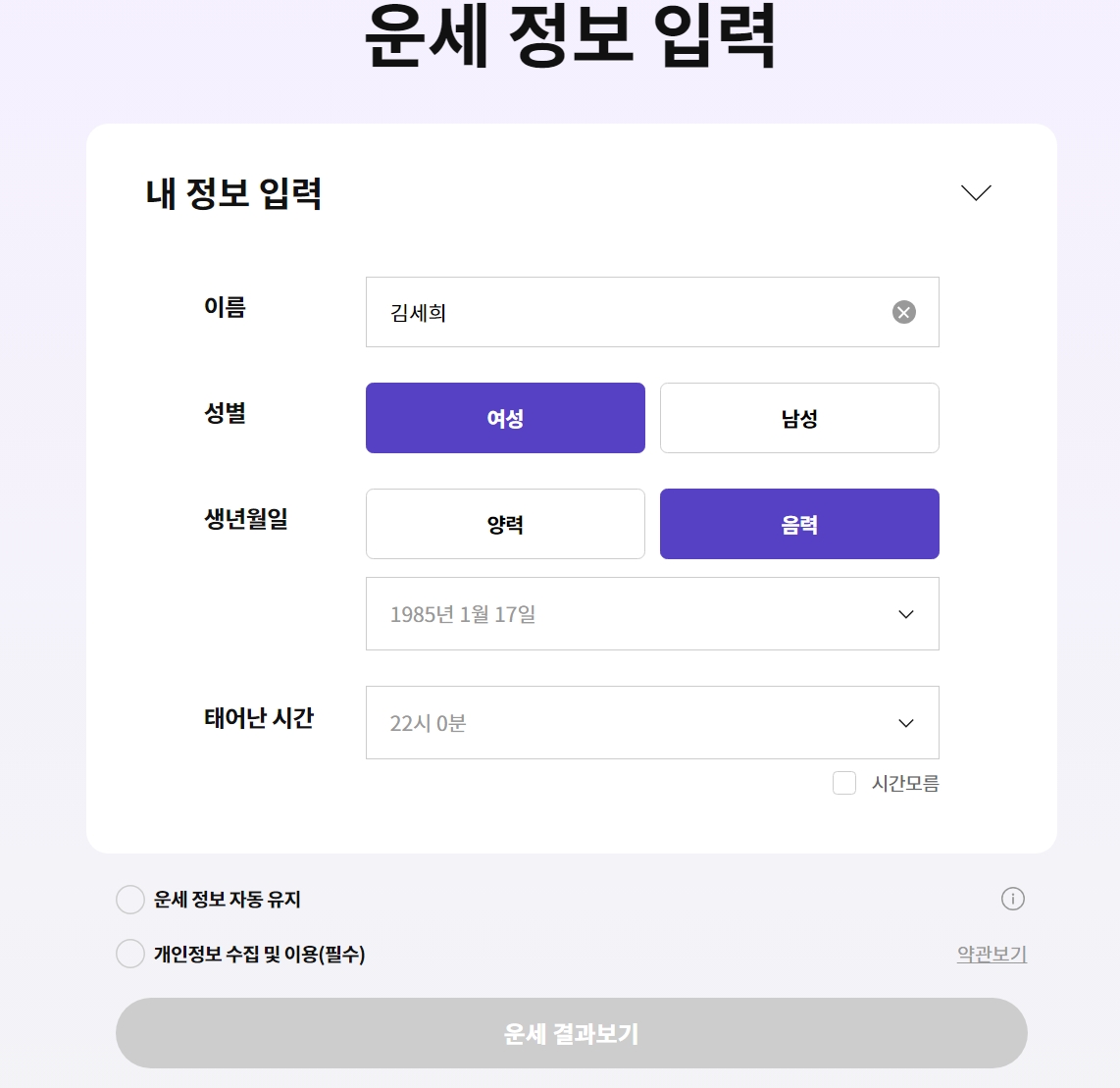 운세 정보 입력란에 오늘의 운세 볼 사람의 간단한 정보를 입력하면, 예정운 - 직장운 - 금전운 - 건강운 순으로 아주 자세하게 풀어줍니다. 무료지만 왠지 돈을 지불해야 할 것처럼 만족스러웠습니다.