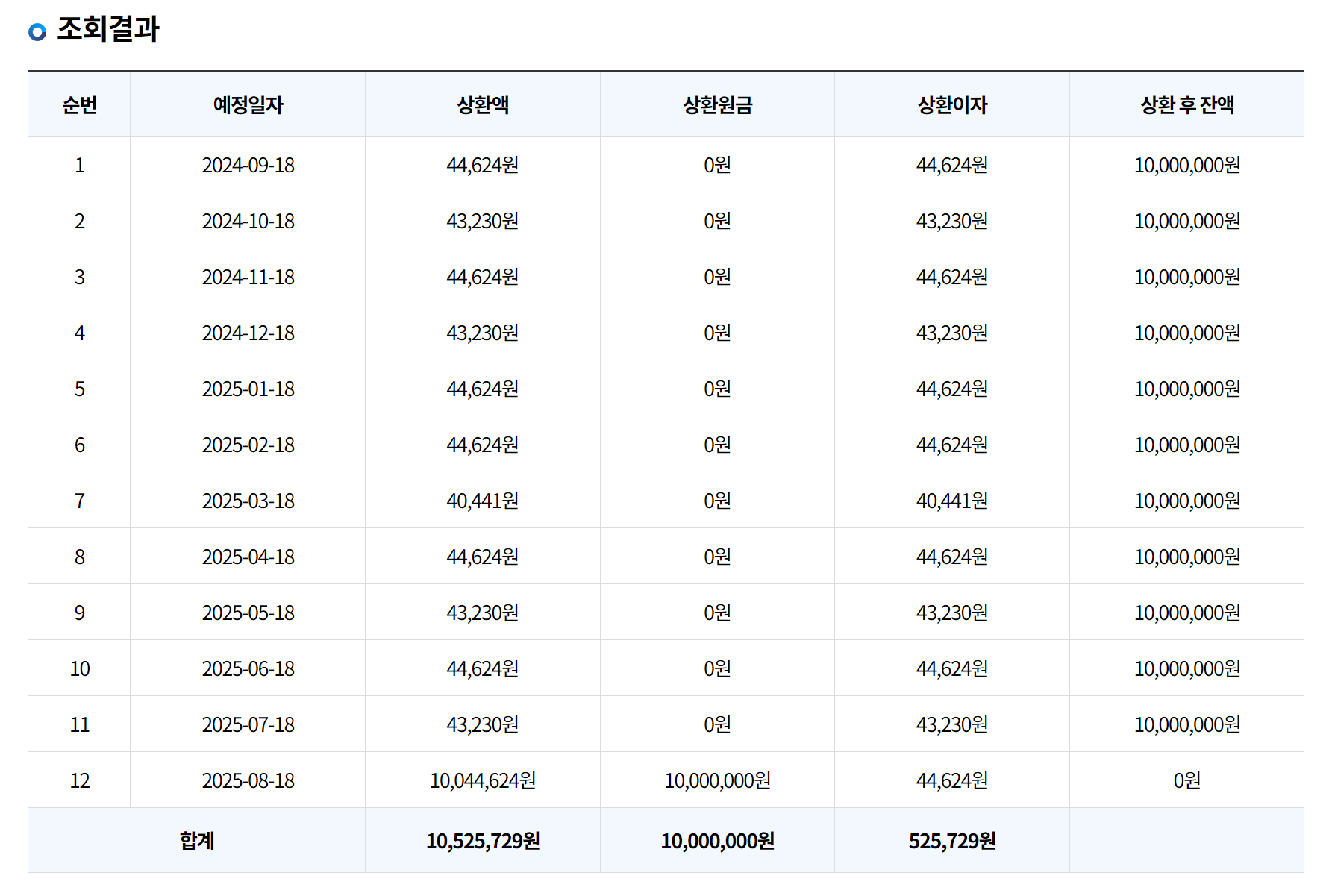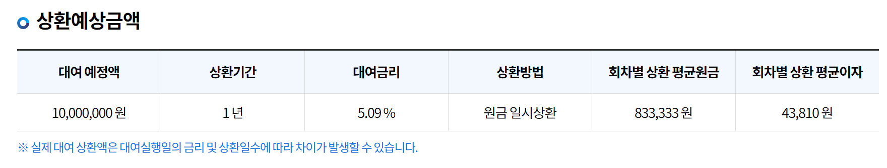 상환 방식은 원금 일시상환입니다. 대출 기간 동안 매달 이자만 납부하고, 만기일에 원금을 한꺼번에 상환하는 구조입니다.