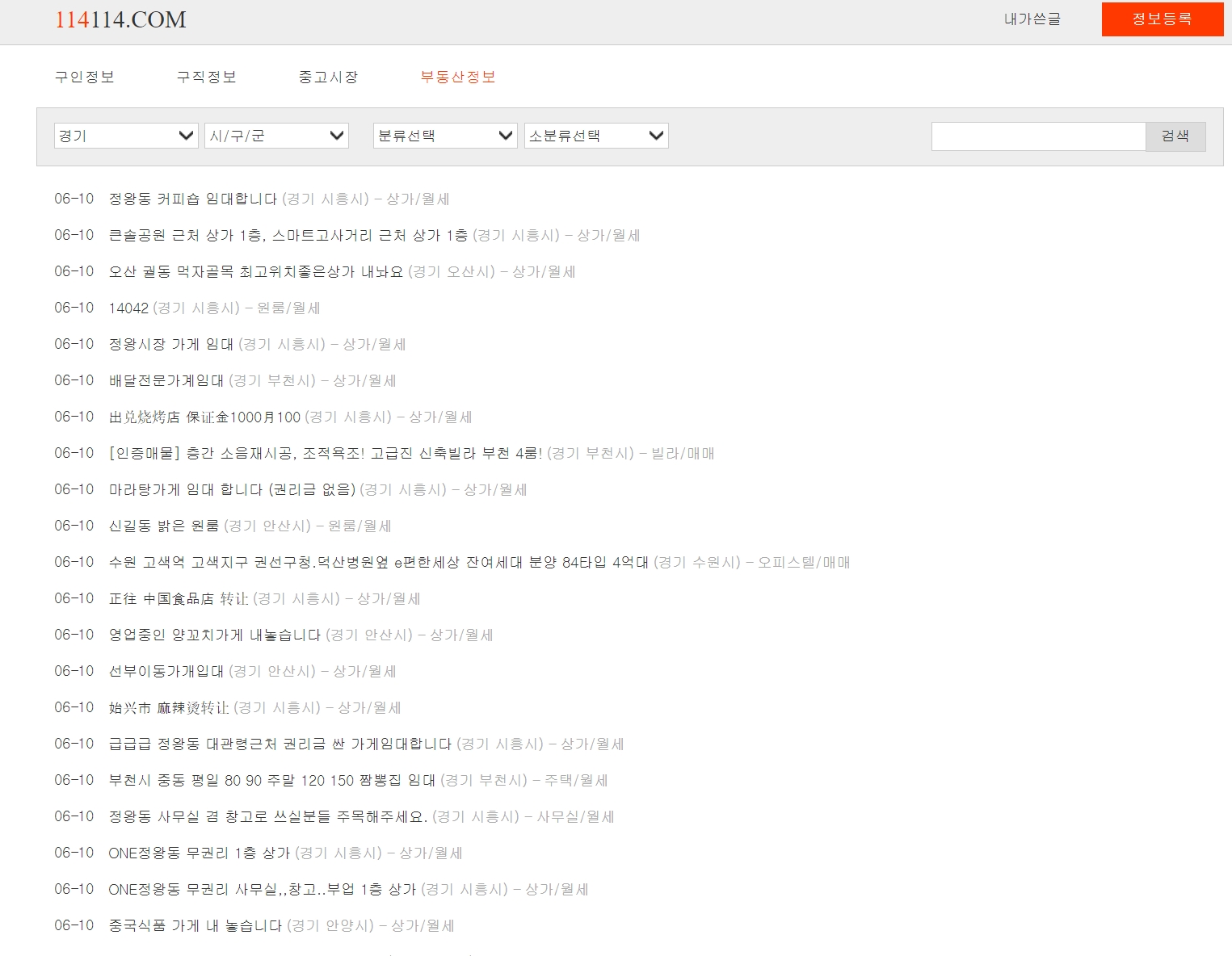 부동산정보에는 상가 - 월세 - 매매 등 지역별로 부동산 정보가 기재되어 있습니다.